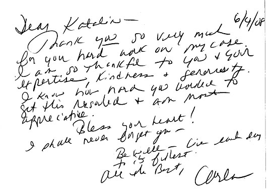 Thank you so much for all that you have accomplished on my behalf. You were a pleasure to work with. You were unrelenting in dealing with bureaucries and the dreaded insurance companies. I never could have managed without you!