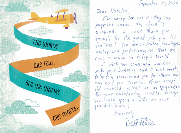 My guess is that your job can be thankless at times. So, I am writing to say thanks for the work you do for me, you are a real help and I feel so much better now that I have a competent person to take the enormous weight off of my shoulders.