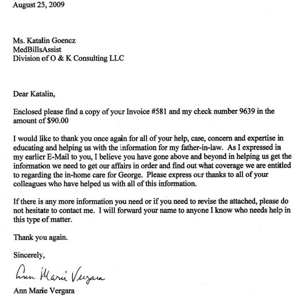 I have put off long enough thanking you for the wonderful job you did for me with two major insurance companies. You were able to do in matter of weeks what I couldn't get done in three years. Due to your efforts we had a better Christmas and we are looking forward to the New Year. Your rates are also very reasonable. We thank you for a job well done and please use this in your Newsletter if you think the message is of benefit to you."